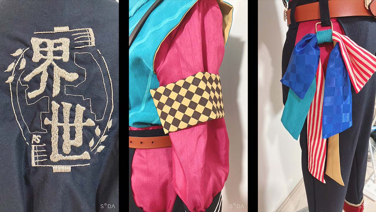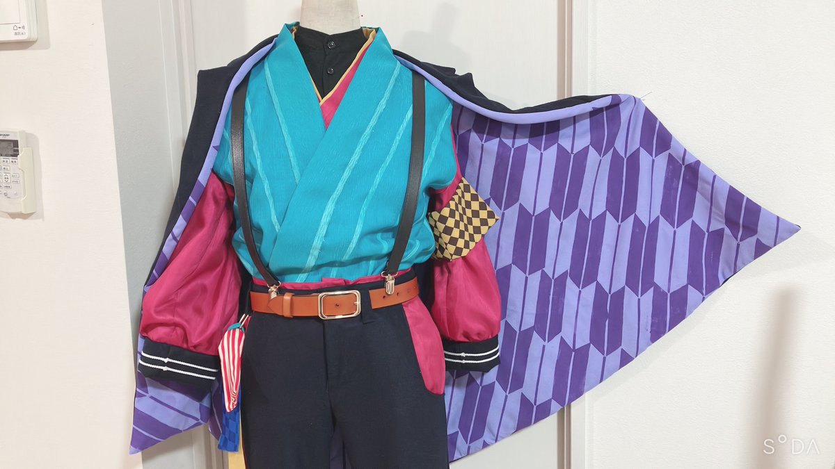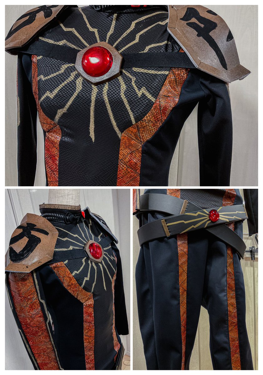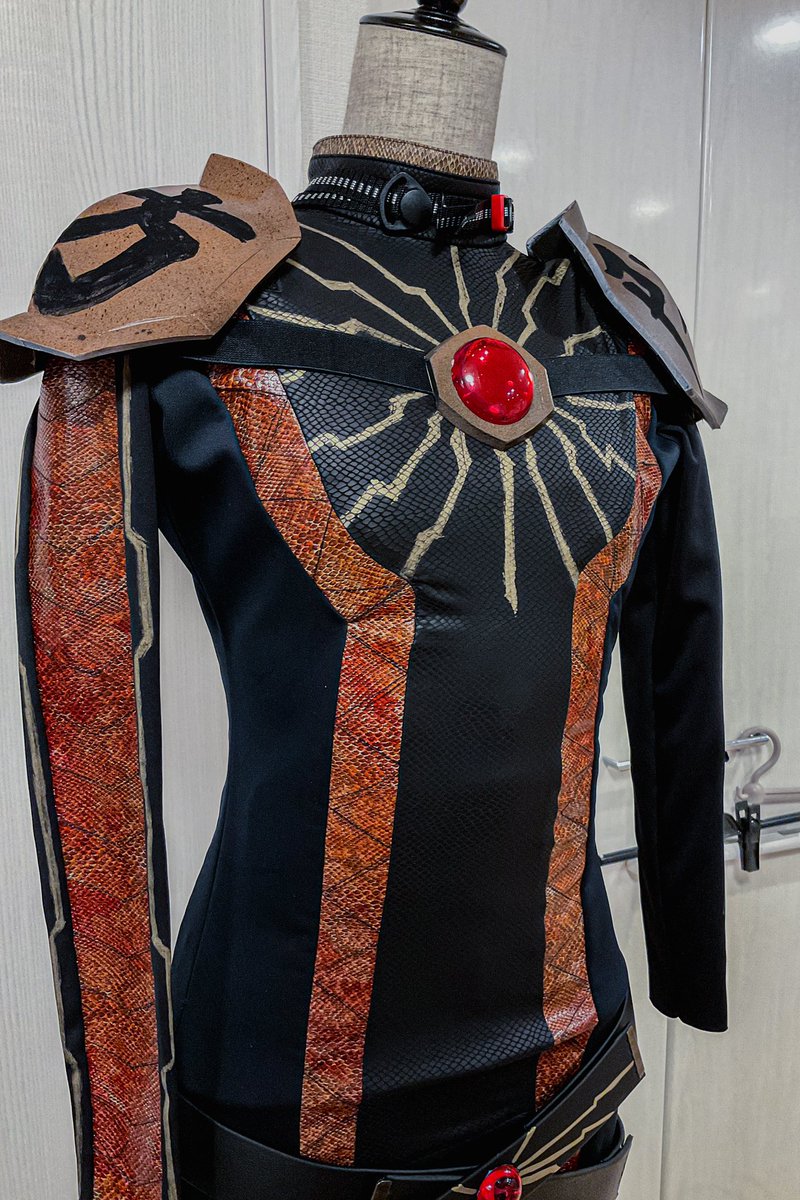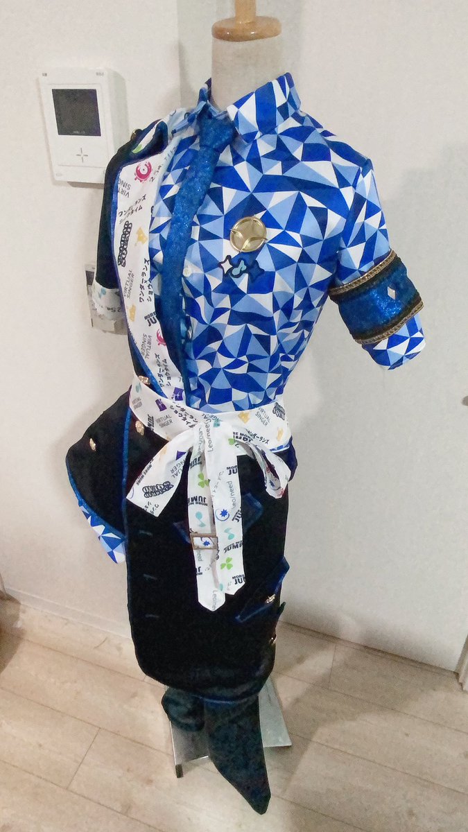 東雲彰人サラマンダーver 防衛隊員しののめ~!日々防衛のためスーツに改良を加え、相対してるサラマンダーから採取した鱗つかって耐久性を高めました(妄想) ウエットスーツっぽいかんじをイメージして素材をチョイス!胸だけ素材違い! #プロセカ衣装部 #りりかるルナさんの衣装製作 #prsk_cos