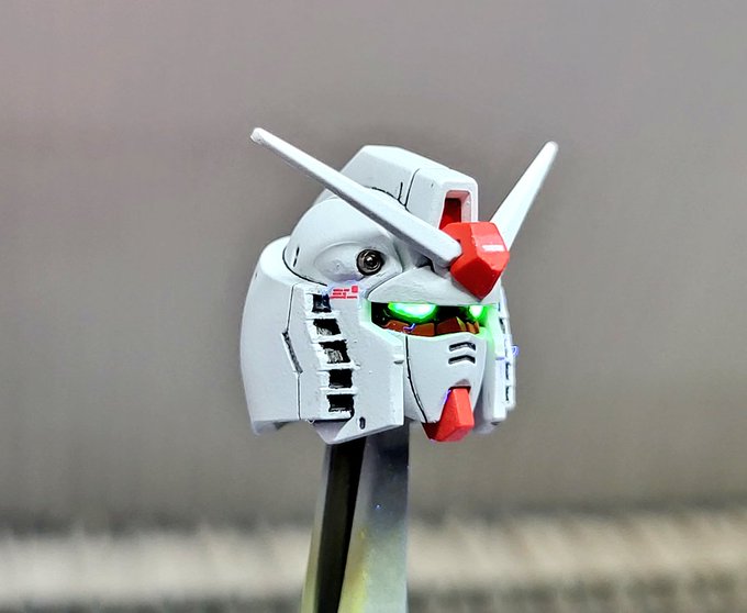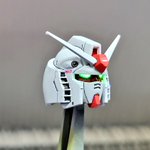 #プロトタイプガンダム 頭部だけ完成。 ポイントはサイドダクトの深堀りと横のスジボリ。バルカン砲をメタルパーツにコンバート。 ツインアイを蛍光塗装。蛍光イエローなんだけど緑に光ってる?🤔 メイン+リアカメラはミラー+クリアレッドフィニッシュ。 #ガンプラ
