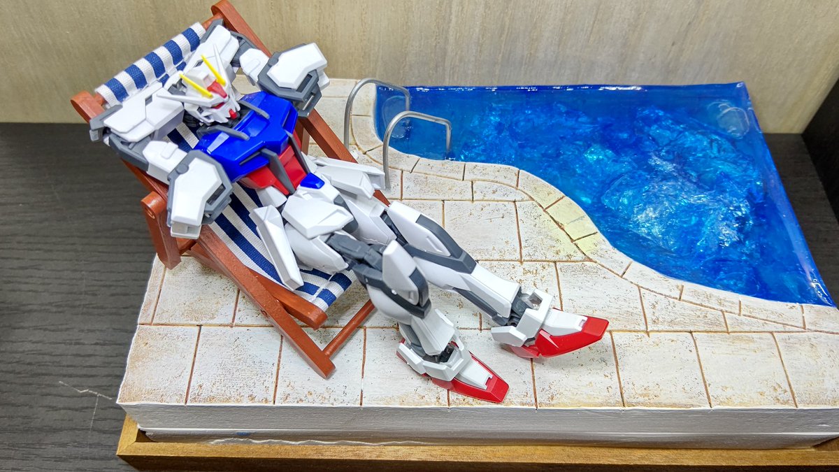 プールサイド完成しました❗️ 水着のフィギュアを持ってないから EGストライクガンダム #ジオラマ #プール #プールサイド #ガンプラの画像貼るとRTされると聞いて #ガンプラ好きな人たちと繋がりたい #フィギュア