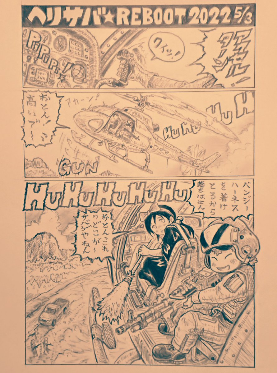 `20年代サバゲ昔話「#ヘリサバ レポート漫画3」 `80年代サバゲは河原でコンビニ弁当が定番でしたが、今時のサバゲはお洒落なケータリングが来るのですね~ #POLICEKITCHEN さんの黒いバン車がヘリコプターともマッチした風景です。
