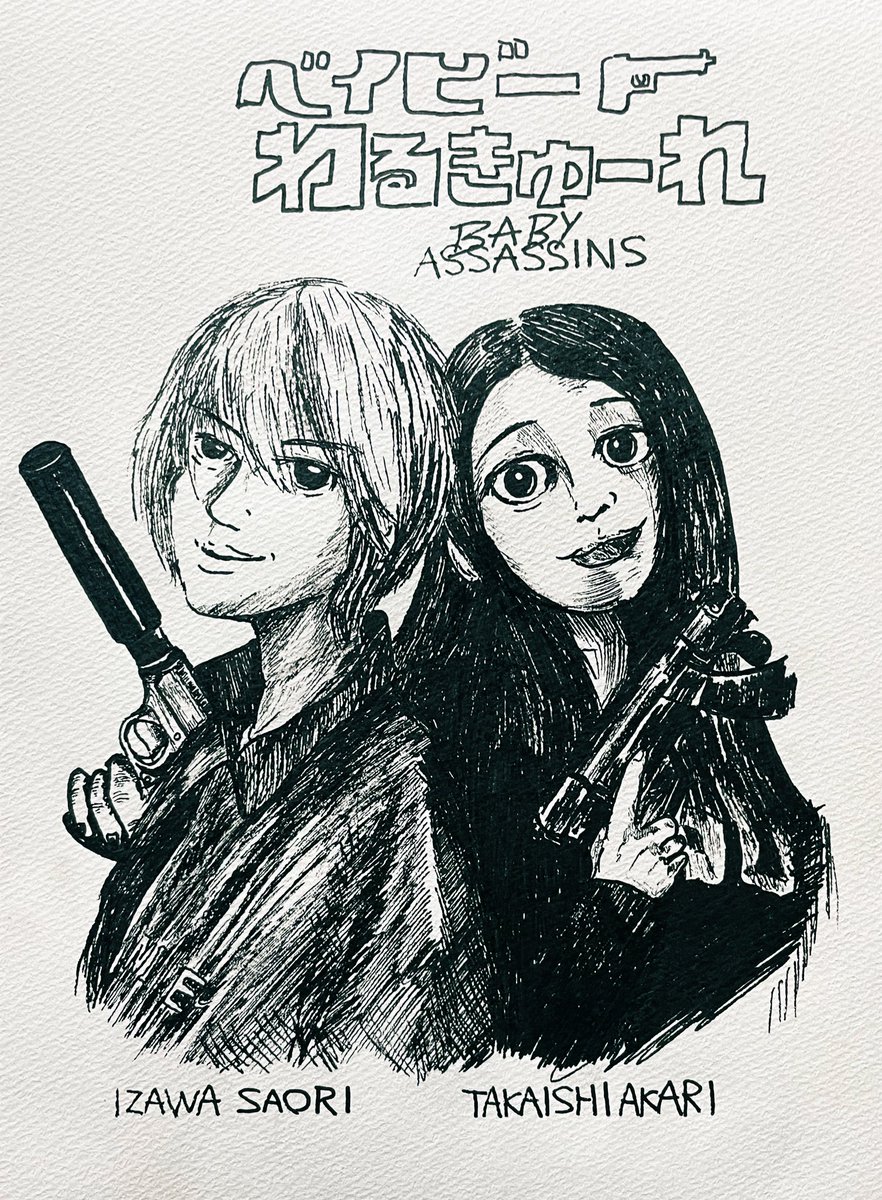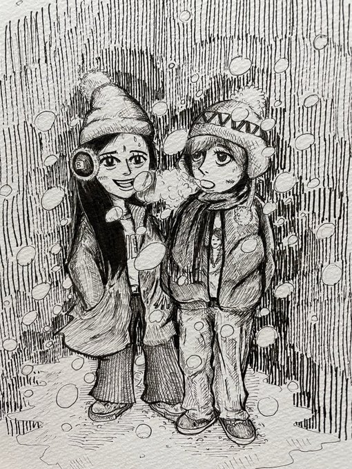 東京は ひどい大雪です 明日は凍結注意 今日はどこにもいけなかったので 雪の降るある夜の まひろとちさとを描きました。 #ベイビーわるきゅーれ #ベビ絵 #イラスト #イラスト好きと繋がりたい #絵描きさんと繋がたい #伊澤彩織 #高石あかり #東京雪 #雪が降ってきた #ペン画