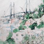#りえこさん冒険の思い出 その675 横浜。ベイブリッジは近くで見ると迫力があり、遠くから見ると風景に溶け込みなかなかいい〜かな? #絵 #旅 #水彩画 #スケッチ #watercolor #横浜 #ベイブリッジ minne.com/ritakahashi4 rieko44.base.shop