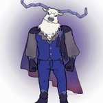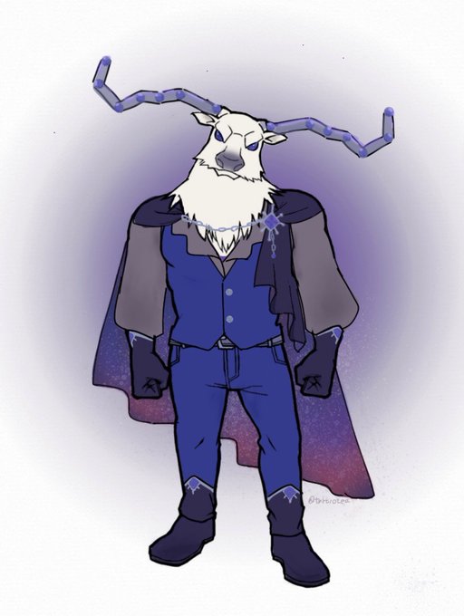 青や紫の高レアが金細工職人しかないので夜空のような衣装をデザインしました🌌💫 かっちりとした衣装を着て欲しいのでベストを着てもらいましたがワイルドなイメージもあるので胸元は開けました。角は北斗七星イメージです⭐️ #断罪狩人S24SSRおめでとう #ベインちゃんはいいぞ #第五人格イラスト
