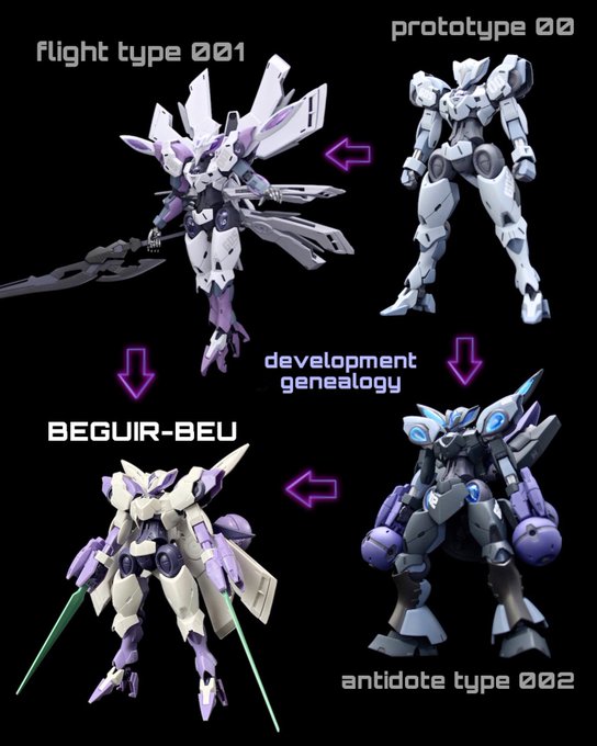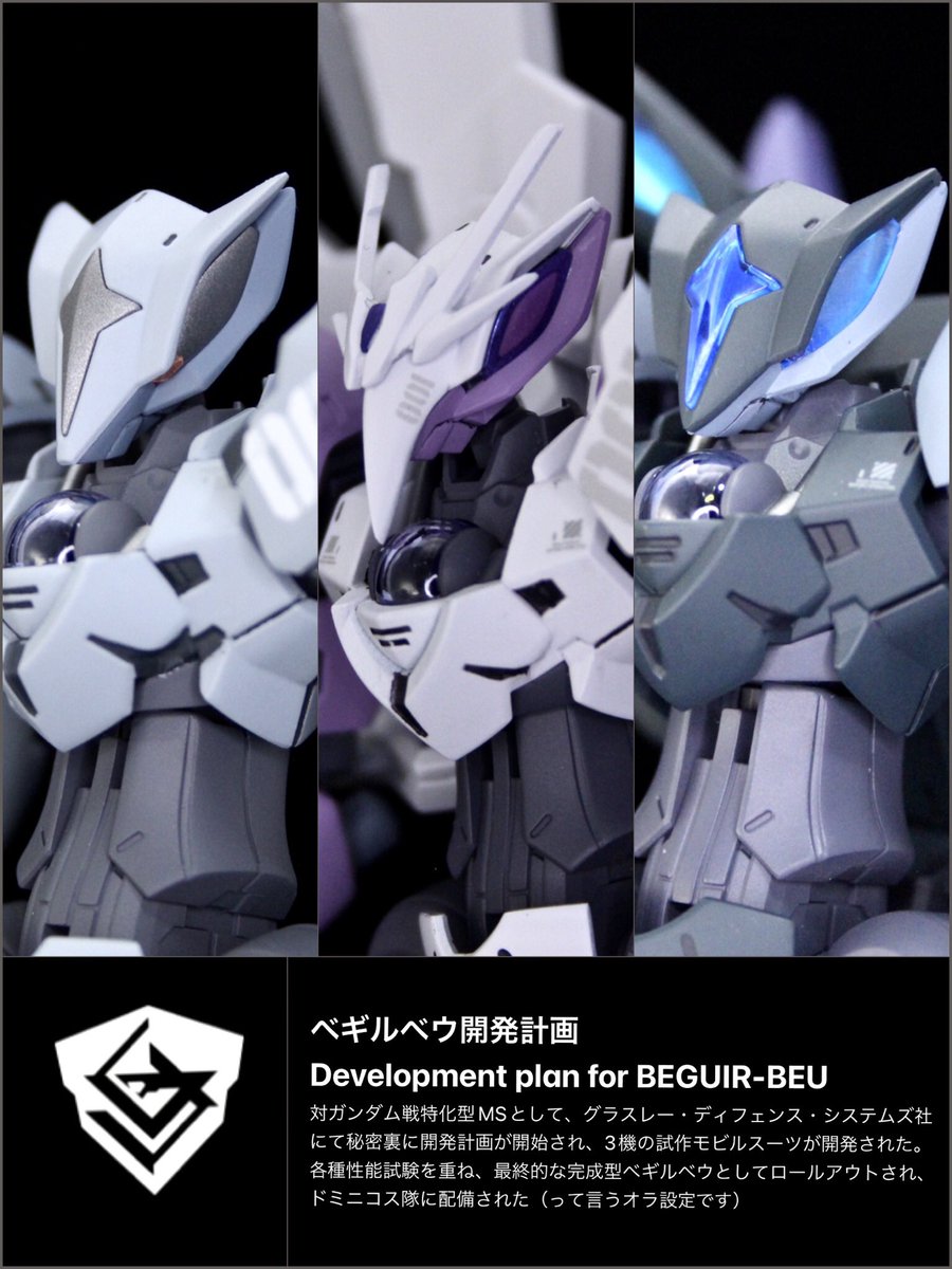 #水星の魔女Noガンダム祭 私はグラスレー社推しなので乗りまーす😎✨ #水星の魔女 の前日譚(prologue)に登場するベギルベウが好き過ぎて、#ベギルベウ開発計画 というコンセプト立て、こんな試作機を経てロールアウトされたんじゃない⁉︎的な妄想設定で3機製作しました♬ #G_Witch