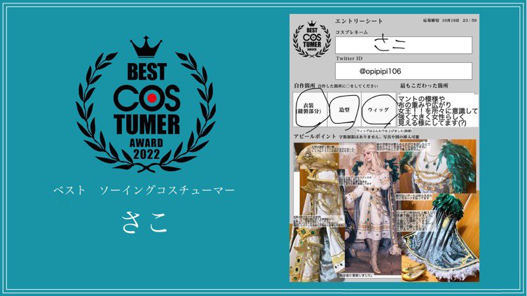 #ベストコスチューマー2022秋 ベスト・ソーイング コスチューマー2022秋に選ばれました! 布や刺繍等、こだわって作った衣装で受賞できて嬉しいです🪡 池ハロ30日(日)15:05頃〜 ステージで授賞式があるそうなので見てください!今回は壇上します twitter.com/bestcostumer/s…
