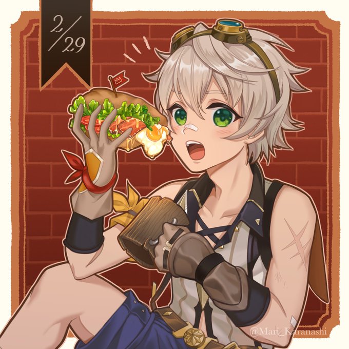 ベネットお誕生日おめでとう!!🎉🎂✨✨ 冒険初期からかなり助けてもらったから、せめて絵の中ではおいしいものいっぱい食べさせたくなる...🍖 #原神 #GenshinImpact #bennett #ベネット生誕祭2022 #ベネット