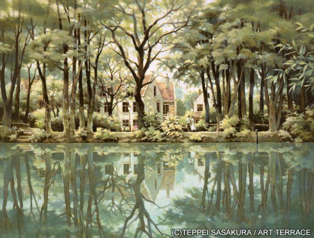 笹倉鉄平 Teppei Sasakura 『永遠(とわ)に~Lac d’amour~』 1999年 #ベルギー🇧🇪 「笹倉鉄平 全版画集」」 「ポストカード・セット」に収録されています 「額付きポスター」ございます 笹倉鉄平ちいさな絵画館 kaigakan-teppei.net #笹倉鉄平 #絵 #油彩画 #緑 #アート好きな人と繋がりたい