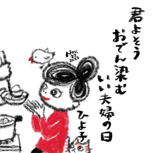 今日11/22は、#いい夫婦の日。 #ペットたちに感謝する日 でもあるそうです。 毎朝6時台に予約投稿するのだけど 今日はなぜか予約を忘れていて 取材で帰ったら、この時間に! #俳句 #おでん #haiku #AdobeFresco #赤と黒の絵日記 #イラスト #イラスト俳句 #猫のいる暮らし #絵描きさんと繋がりたい