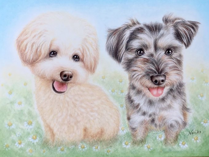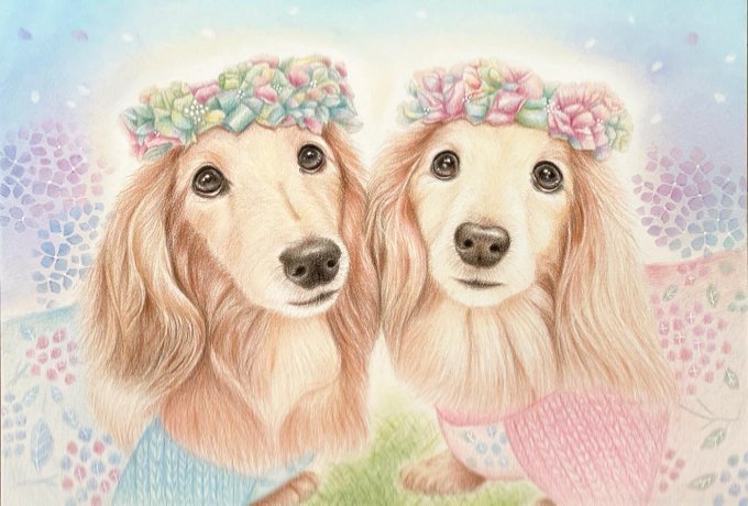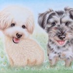 ルカちゃんユイちゃんの色鉛筆画です♡︎ʾʾ以前ツイートした、ベル君の双子の娘ちゃん達です♡︎ʾʾそっくりな美人姉妹( ˘͈ ᵕ ˘͈ )♡︎ʾʾご依頼ありがとうございましたー❤#犬の似顔絵 #ペットの絵オーダー #絵描きさんと繋がりたい #みんなで楽しむTwitter展覧会 #アナログ絵 #イラスト好き