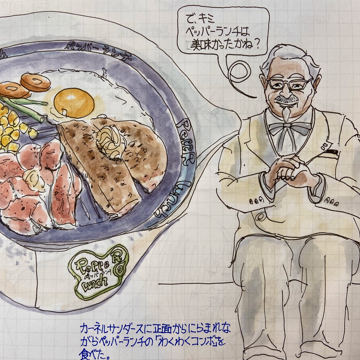 ペッパーランチに初めて行った時のスケッチ。カーネルサンダースに睨まれながら食べたので、とても落ち着かなかった。そして今度食べにいく約束をする羽目に… #絵 #イラスト #スケッチ #水彩画 #ペッパーランチ #絵描きさんと繋がたい #イラスト好きな人とつながりたい #KFC