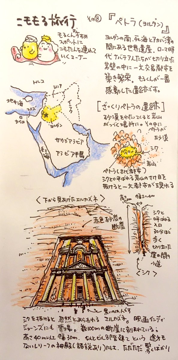 #こももる旅行 その8 #ペトラ(ヨルダン) ヨルダンの南。かつてモーゼ達がさまよった灼熱の荒野。 岩山の切り立った裂け目にこわごわ入っていくと、その奥に古代の大都市が現れる。 これほどまでに ドラマチックな遺跡を見たことがない。ペトラ必見です。 #イラスト #トラベラーズノート twitter.com/komomorubiyo…