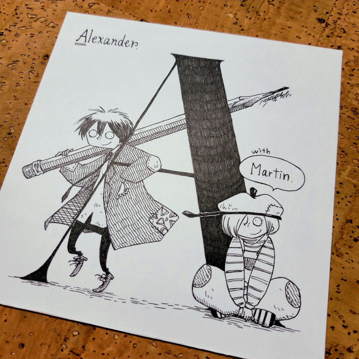 『A』は『ALEXANDER』 鉛筆を持った彼がアレクサンダーです。孤児院に住んでいますが、自由で誇り高く生きています。 お隣は仲良しのマーティンです。 ↑あんなこと言ってますが『A』はエースだよね(笑) #ペン画 #art #illustration #monochrome #ペン画アート