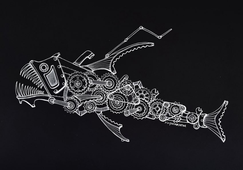 今日もお疲れ様でした✨✨ 台風に振り回される1週間になりそうです。皆様、お気をつけてお過ごしください( ; ; ) ⚙ホウライエソ⚙ #スチームパンクイラスト #深海魚 #歯車イラスト #ペン画 #ホウライエソ #作品をみてくださいあわよくばフォローしてください祭