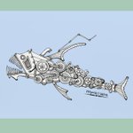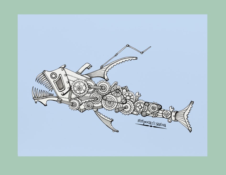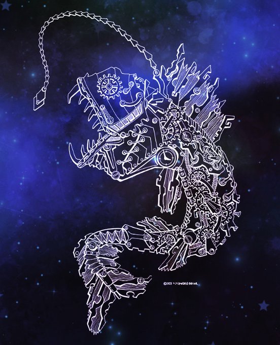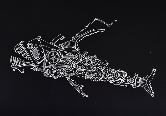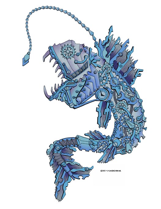 今日もお疲れ様でした✨✨ 大荒れ天気にお気をつけてお過ごしください💦 ⚙ホウライエソ⚙ #創作 #スチームパンクイラスト #歯車イラスト #ペン画 #ホウライエソ #深海魚 #絵柄好みって人にフォローされたい