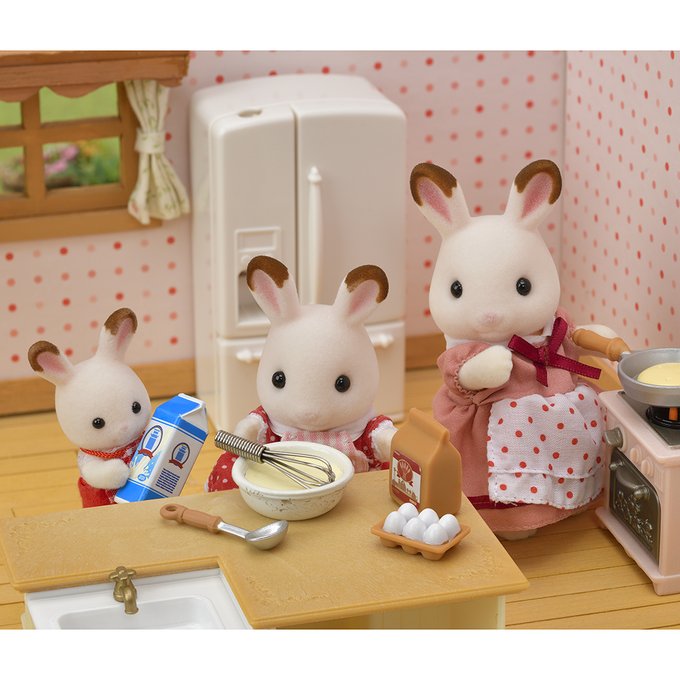 今日はみんなでホットケーキ作り中🥞 「ぎゅうにゅうもってきました!」 「ありがとう、混ぜるからもうちょっと待ってね」 「こぼさないように気を付けて~」 おや?甘い香りがしてきたみたい! 美味しいパンケーキが焼けるといいですね🎵 #シルバニアファミリー #シルバニア #ホットケーキ