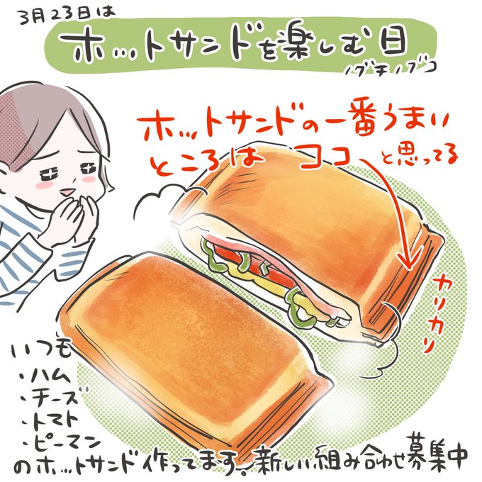 今日3/23は、#ホットサンドを楽しむ日 理由がかわいい。 3/13 #サンドイッチの日 に サンドイッチを焼く音 「ジュウ(10)」を足して3/23❤ 我が家のホットサンドメーカー 4年物。超重宝! #俳句 #花盛り #haiku #AdobeFresco #赤と黒の絵日記 #イラスト #イラスト俳句 #絵描きさんと繋がりたい