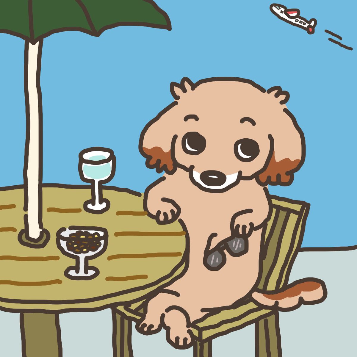 まずは、オープンテラスで持参した、いつものご飯と水道水をいただきましたよ❣️ ちょ、まてよ。そのテーブルのはなんだ❓ #ミニチュアダックスフンド #イラスト #オープンテラスでランチ #ぼくだけいつものご飯 #ホットドッグ #ぼくを食べるのか