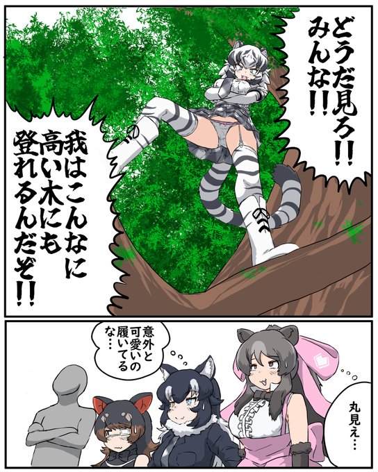 高い木に登って凄さをアピールするホワイトタイガーさん #けものフレンズ #タイリクオオカミ(けものフレンズ) #オーストラリアデビル(けものフレンズ) #カムチャッカオオヒグマ(けものフレンズ) #ホワイトタイガー(けものフレンズ) pixiv.net/artworks/10272…