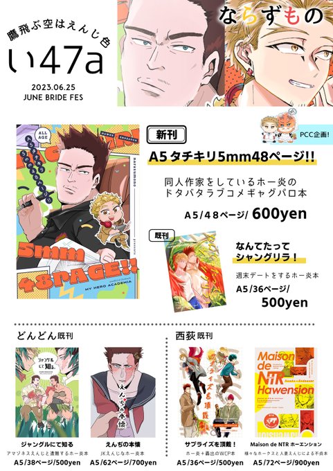 06月25日(東京)JB2023 鷹飛ぶ空はえんじ色にて頒布予定のお品書きです! 新刊サンプル、通販に関しては引用ツイからご確認ください🙇♀️ホー炎PCC企画も参加予定です…! トリオキニも設置していますので、ご入用の方いらっしゃいましたらよろしくお願い致します~! #0625鷹えん新刊情報 #ホー炎PCC twitter.com/iekei_souhonza…
