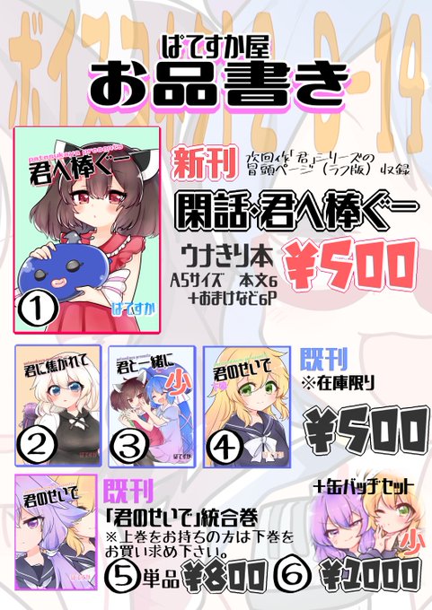 >>>まさかの入り口<<< 3/27開催の #ボイスコネクト2 D-14にスペースを頂きました「ぱてすか屋」 (ゲスト参加:「ハイロキツネ」さばとら) お品書き+試読はこちらになります。 ※ぱてすか屋とハイロキツネ別会計なので予めご了承ください! よろしくお願いします~! #ボイスコネクト2サークル参加
