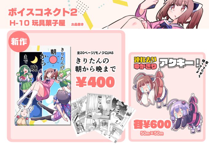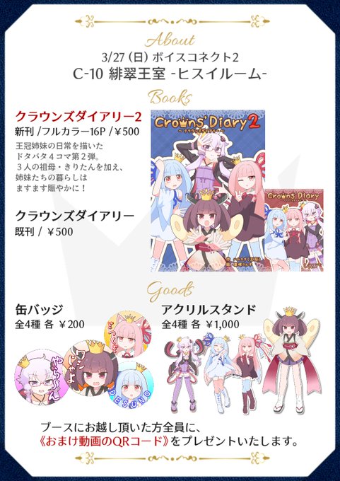3/27(日)#ボイスコネクト2 お品書きです。 新刊「クラウンズダイアリー2」他、ゆかちゃんきりたん缶バッジ、きりたんアクスタが新登場です。 またブースにお越し頂いた方全員に 《おまけ動画のQRコード》をプレゼント! 【C-10】にてお待ちしております。かにたま。 #ボイスコネクト2サークル参加