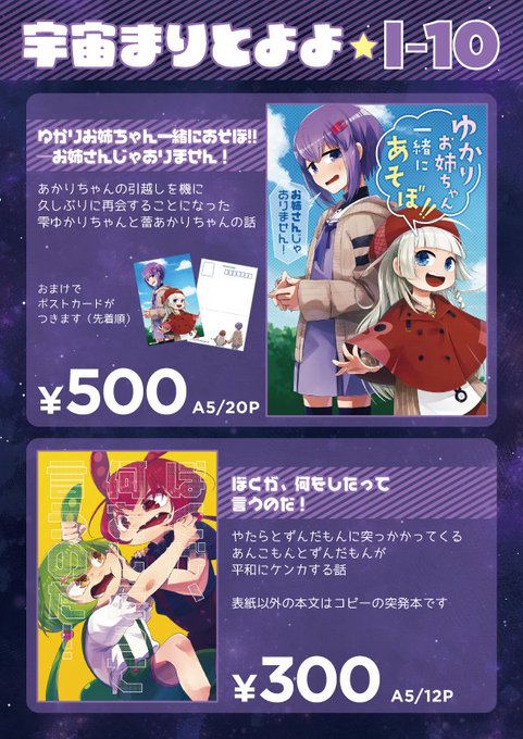 3/27ボイコネ2のおしながきです!! 雫ゆかりちゃんと蕾あかりちゃんの本と、ずんだもんとあんこもんの本が出ます!!!!!!! スペースは【I-10:宇宙まりとよよ】です。遊びにくるのだ!!! #ボイスコネクト2サークル参加 #ボイスコネクト2