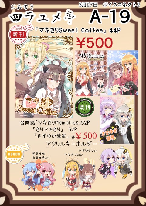 3月27日(日)大田区産業プラザPiO開催「ボイスコネクト2」 A-19「四ラユメ亭」のお品書きです 新刊のマキきり本と既刊、アクキーを頒布予定ですので よろしくお願いします #ボイスコネクト2 #ボイスコネクト2サークル参加