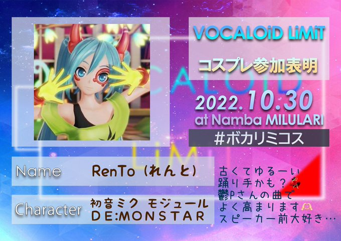 8/27開催「VOCALOiD LiMiT」三周年+ミク生誕祭! ________________ Day・8/27 START・13:00~ PLACE・なんばMILULARI Delight @milulari ________________ ボカリミではコスプレ大歓迎! 僕もカゲプロのカノのコスプレしてます #ボカリミコス もぜひ! 詳細⇨ twipla.jp/events/567822 #ボカリミ