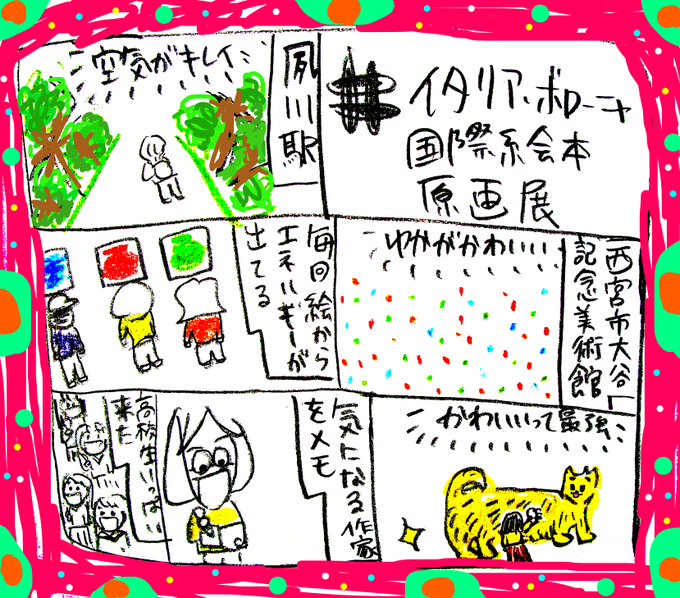 【#ボローニャ国際絵本原画展】 土曜日に行ってきました。夙川駅から美術館までの道のり、緑。空気がおいしくて、綺麗 ■美術館・・床かわいい ■毎回絵からエネルギーが出てる ■可愛いって最強!! ■学校の課題でやって来る人も多い #西宮市大谷記念美術館 #絵本 #漫画が読めるハッシュタグ #美術館