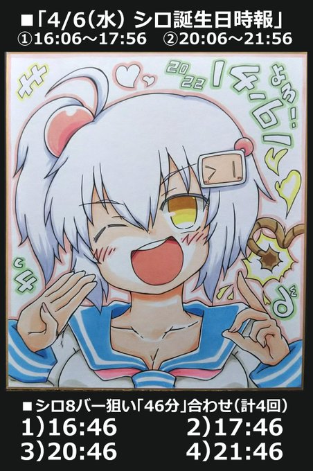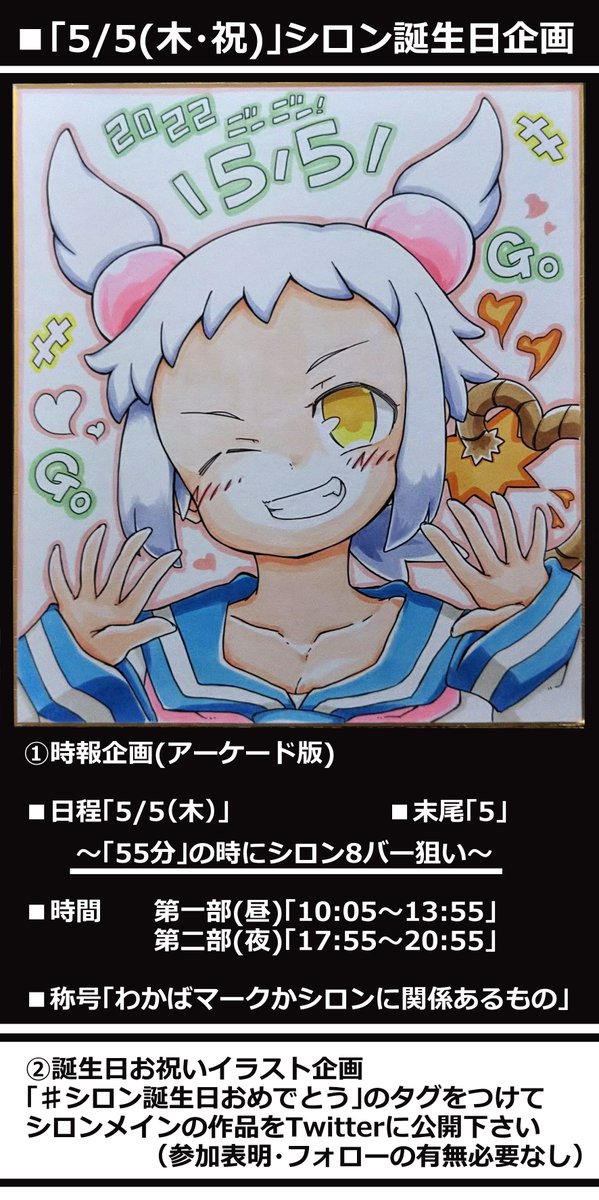 ■時報&イラスト企画告知 「5/5(木・祝)」 シロン誕生日にお祝い8バー狙いも含め時報(アーケード版)とイラスト企画やります 参加表明やフォローの有無とか何もいらないので良かったら宜しくね! ■時間「10:05~」 ■末尾「5」 ※「55」の時シロン8バー #ボンガ時報 #シロン誕生日おめでとう