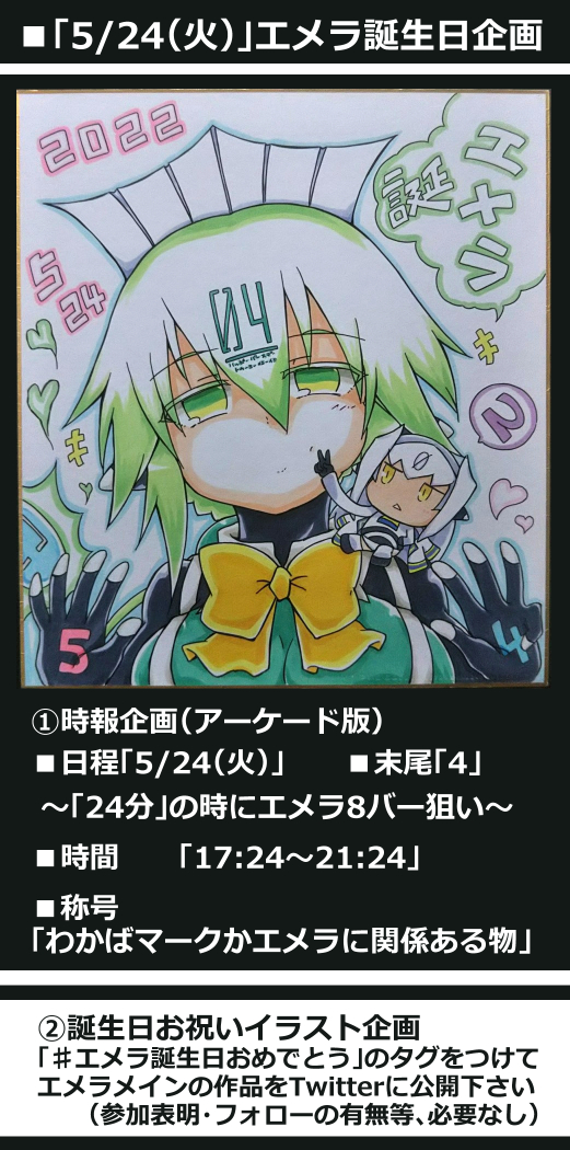 ■時報&イラスト企画告知 「5/24(火)」 3日後のエメラ誕生日にお祝い8バー狙いも含め時報(アーケード版)とイラスト企画やります 参加表明やフォローの有無とか何もいらないので気軽に宜しくね ■時間「17:24~」 ■末尾「4」 ※「24分」の時エメラ8バー #ボンガ時報 #エメラ誕生日おめでとう