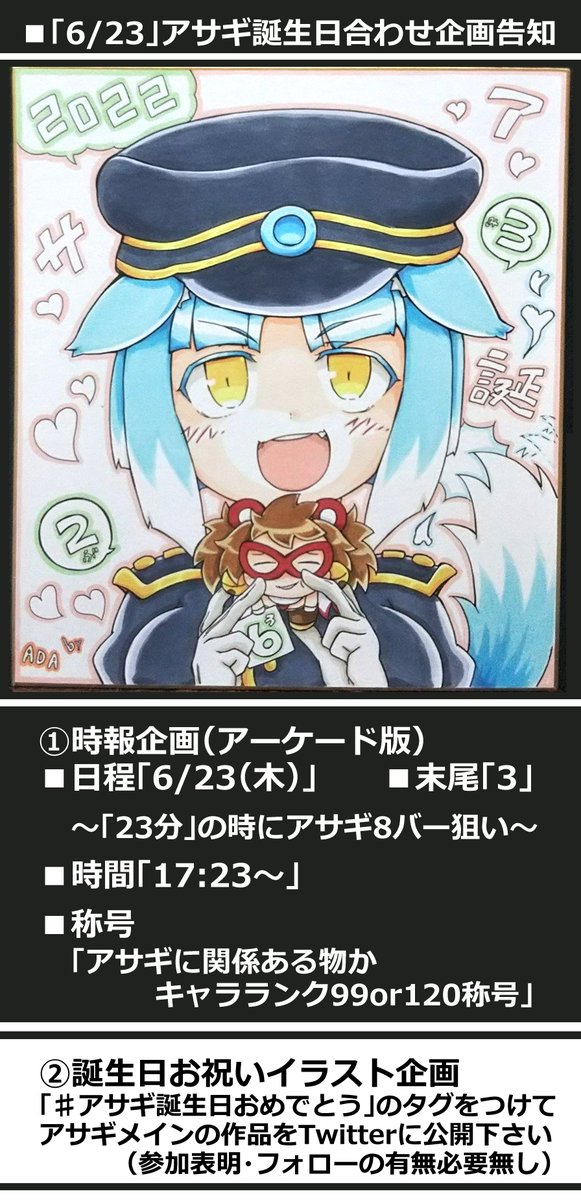 ■時報&イラスト企画告知 アサギ誕生日合わせで時報(アーケード版)とイラスト企画します 参加表明やフォローの有無等何もいらないので興味有の際は気軽に宜しくね ■日程「6/23(木) ■時間「17:23~」 ■末尾「3」※「23分」の時アサギ8バー狙い #ボンガ時報 #アサギ誕生日おめでとう