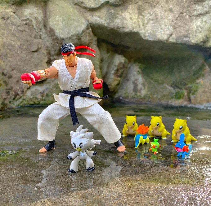 おざます⭐️くねくねマンです😊今日は動画か写真どっちをツイしようか迷いましたが😅写真にします☝️💕 今、ポケモン盛り上がってますしね👍😊#ポケモン剣盾 #ポケモンフィギュア #オモ写 #リュウ #ストリートファイター #野外撮影