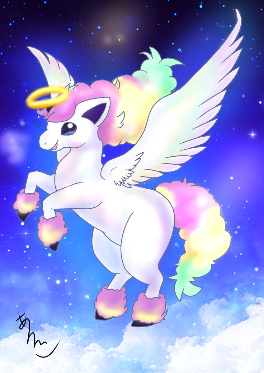 #毎日ポケモンお絵描き 119日目 #ポケモン天使化 #天使の日 当日参加絵はガラルポニータ! ……、あの、ギャロップはそろそろメガ進化でも巨大マックスでもいいのでペガサスに進化してくれてもいいんですよ?