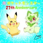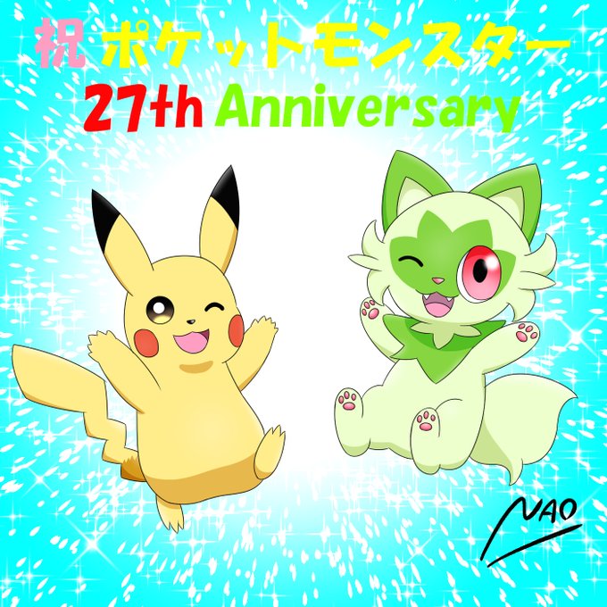 「ポケモンの日記念イラスト 2023」 本日は初代ポケモンが発売された日! というわけで、コン年度も新作イラストで飾ります! コン回はポケモンの代名詞であるピカチュウと、新たな世代の御三家のニャオハちゃんになります! ポケモン27周年おめでとうございます!🎊 #ポケモン27周年 #PokemonDay