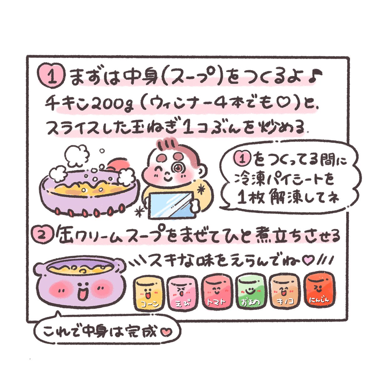 ポットパイ 🍟「次回は私がトライするわ!😋エビのスープで作ってみようっと🦐♡」 🍩「わ〜い!楽しみ😊😊😊」 #ぽちゃ日和 #イラスト #イラスト好きな人と繋がりたい #絵描きさんと繋がりたい #絵柄が好みって人にフォローされたい #4コマ #ポットパイ #レシピ