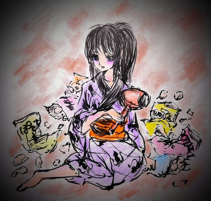 滅茶苦茶頭にきて手の届く範囲のポテトチップの袋をことごとく叩き割った和服女子図 #イラスト #絵描きさんと繋がりたい #頭きた #腹立った #ポテトチップス #和服女子 #砕けたポテチは撮影後スタッフが美味しくいただきました
