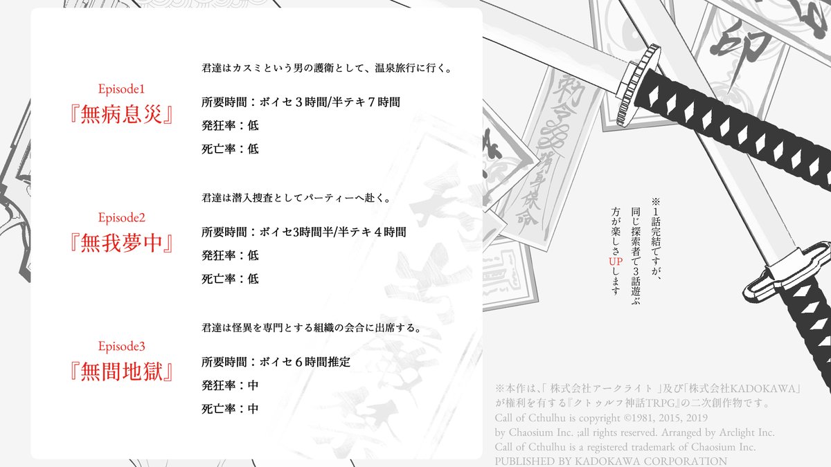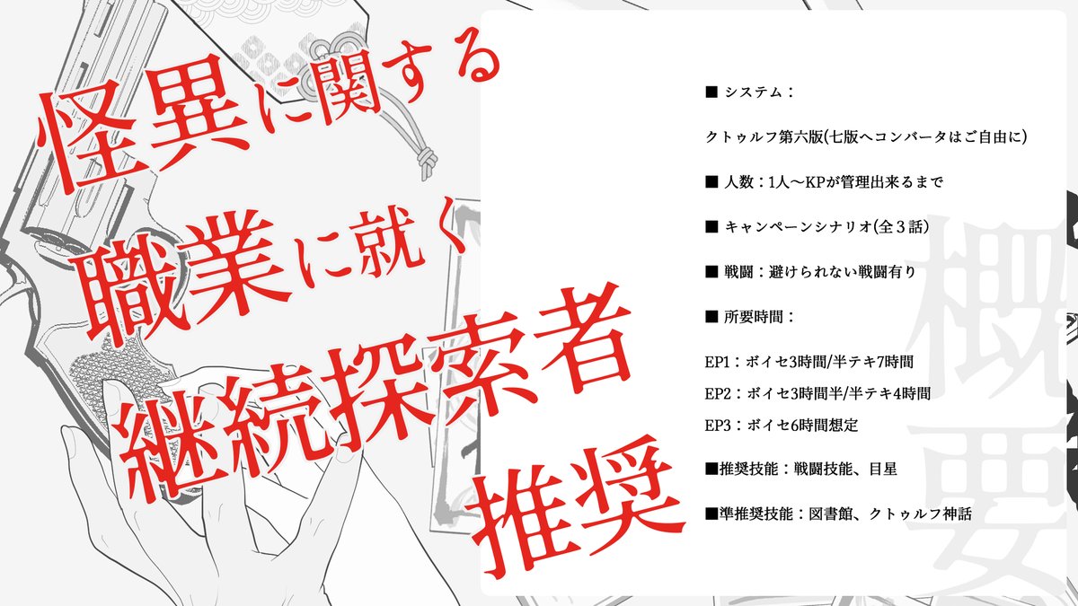 #ポトラ企画シナリオ告知 𝘾𝙖𝙡𝙡 𝙤𝙛 𝘾𝙩𝙝𝙪𝙡𝙡𝙝𝙪 「退魔師達の禁忌録」 ▋性癖 怪異×継続×キャンペーンシ ▋1人~遊べる! もう一度相棒と遊びたい方へ! ▋BOOTHで頒布予定 SPLL間に合わない場合は1話を無料公開。 間に合った場合はNPCの立ち絵が揃うまでセールの予定です。