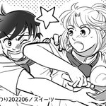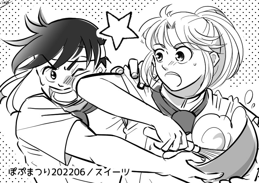 #ポプマ202205スイーツ 久しぶりの参加で💦 スイーツ作りでわちゃわちゃするポプマが見たいなぁと思って描きました! ポプがマムの力技お菓子作りを見てられなくて途中で貸せよってくるけど肘打ちをくらってしまう図(笑