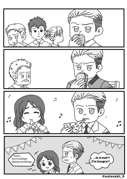 4コマ描いてみました〜 モグモグしがちなポルコの愛しさを誰かに届けたい…☺️ あいついつも何か食べてんなー、みたいな。ツッコミ役はやっぱりピークさんで決まり! #進撃の巨人 #マーレの戦士 #ポルコ・ガリアード #ピーク・フィンガー #AttackOnTitan