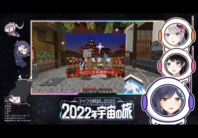 マイクラ肝試し鯖の観光で、屋台を満喫するめにまに御一行 海外勢がきゃっきゃ、日本勢は楽しみながらも見守る感じがよかった👍 クーさん、今年もありがとう! #マイクラ肝試し2022 #長尾百景 #リツキあーと #Maunggambart #Seffynart