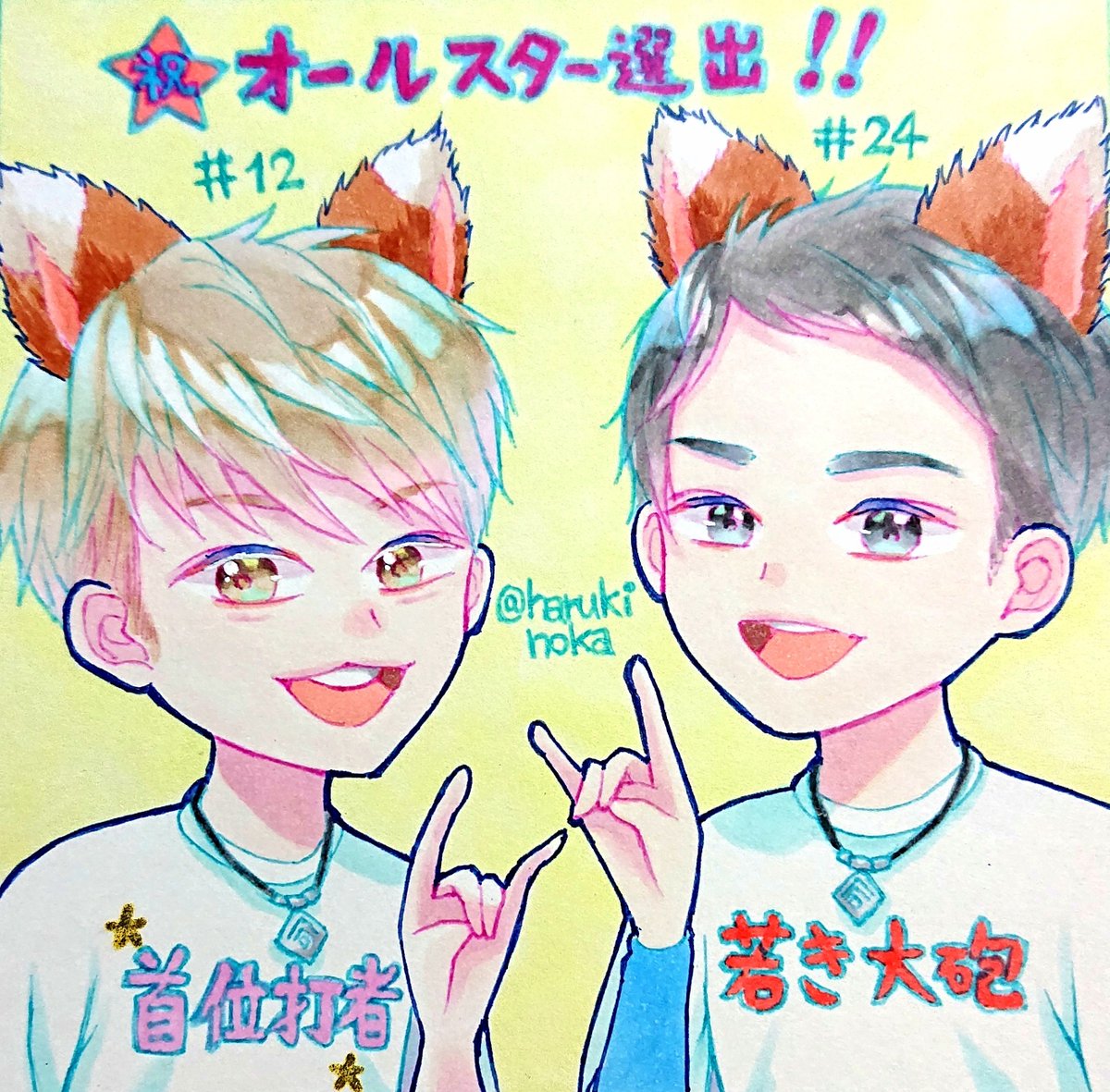 遅れてしまったけどまつごーとジェームスオールスター選出おめでとうございました🎉 二人がもし出場してたらきつね耳付けてたんだろうな~と🦊 来年は出場出来ますように🌠 復帰待ってます✨ #マイナビオールスターゲーム2022 #松本剛 #野村佑希 #lovefighters #マルチライナーターコイズ #コピック