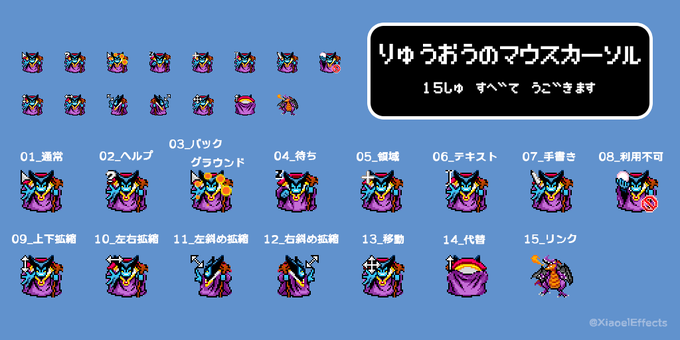 りゅうおうのマウスカーソル15種セットをBoothに置いてみました。ちまちまと動きます。Web閲覧してたらOnカーソルで軽率に真のお姿に(仕様です)。お仕事・ご作業等々のお供にあなたのPCにもいかがですか。。フリーです xiaoel.booth.pm/items/4330755 #DQ魔王WEBオンリー #マウスカーソル #ドット絵