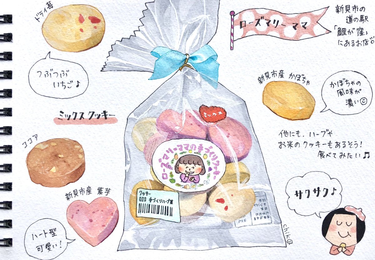 新見市の道の駅「鯉が窪」で購入したローズマリーママさんのミックスクッキー! カボチャや紫芋など地元産の食材が使われています。サクサク食感で、1袋すぐ食べてしまいました⭐︎ 素材にこだわったクッキー、ごちそうさまでした! #食べ物イラスト #マエバラチカのおいしい絵日記