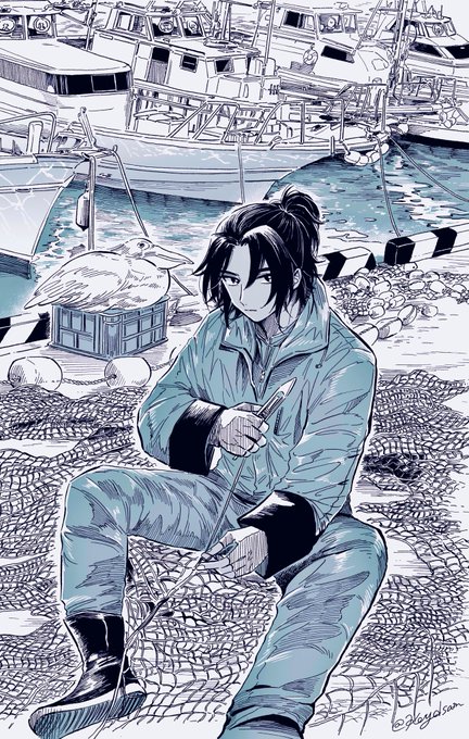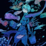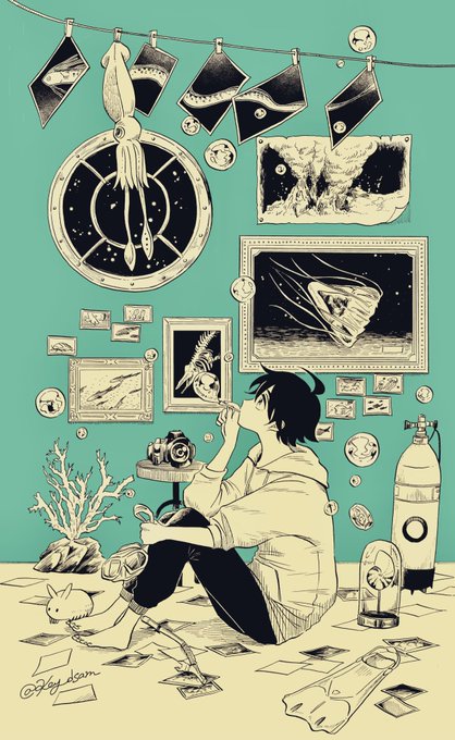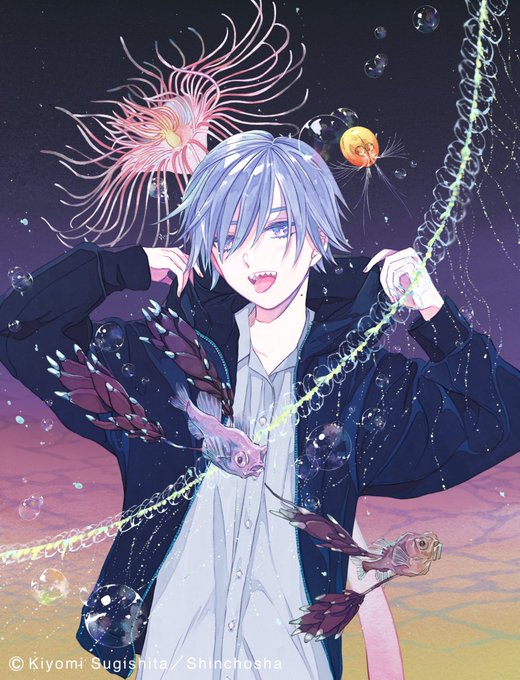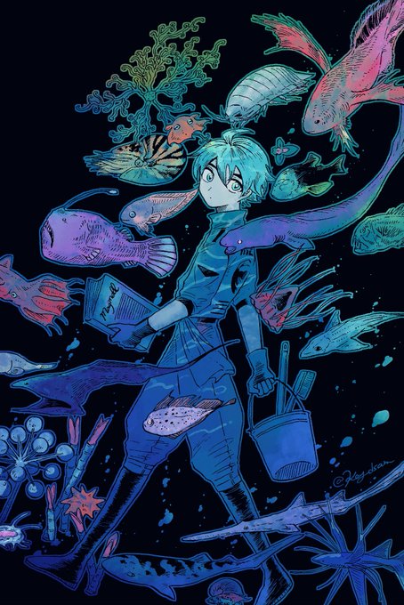 #マグメル深海水族館 第8巻 発売日まであと5日𓂃 𓈒𓏸◌ こちらはカバーの元イラストです。 背景は昼でも夜でもないの空の色=twilight(薄明)をイメージして塗りました。 海面でも海底でもない深海の中深層のことを通称トワイライトゾーンといいます🦈
