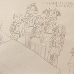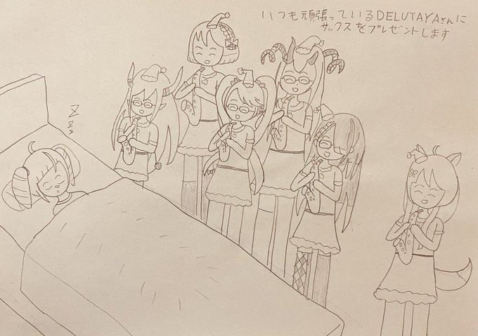 【SaturdayΔ】寝ているDELUTAYAさんにプレゼントをあげようとしているインサイドちゃんMark2と、えま★おうがすとちゃんと、暁月クララちゃんと、魔王マグロナさんと、歌衣イツミちゃんと、フミちゃん #Δrt #インサぁーと #えまの絵馬 #clara_art #マグロナート #Itsumi_s_art #恋フミ