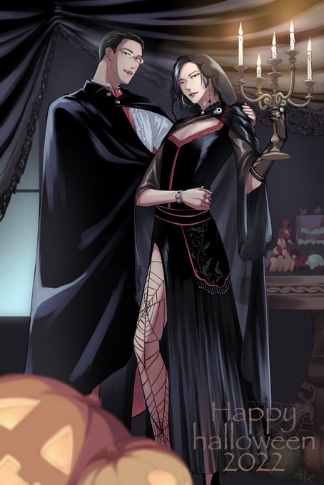 #ハロウィン2022 🎃今年は吸血鬼×魔女です ゴシックっぽさを狙ったつもりがガチな感じになっただけでした😉カンザキくん、女装が板についてきたなぁ どうせお顔潰れちゃうからアップも見てやってください #創作BL #マサカン #ハロウィンイラスト
