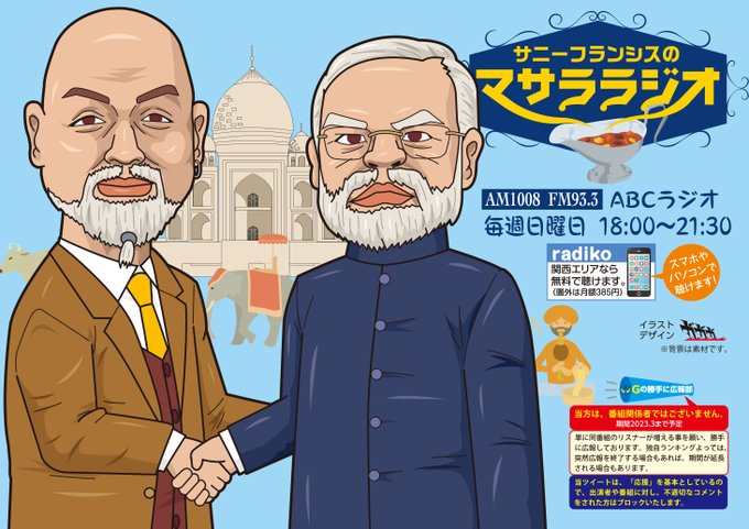 ABCラジオ、サニー・フランシスの #マサララジオ を勝手に広報中😀。絵は放送内でのトークを元にしてます。決して私の独案ではありません😅。サニーさんばっかりいじらない…公平でしょ😉?放送は18時から。 尚来週は4週のため広報休み。次回は29日になります。 #絵描きさんと繋がりたい