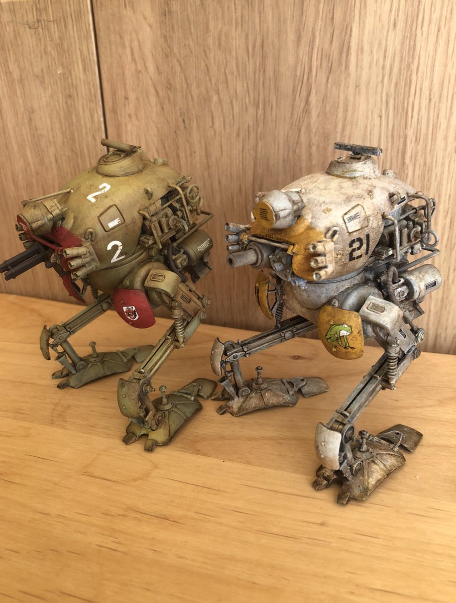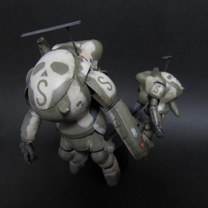 これにて1/20&1/35ファイアボールSG、完成となります。サイズ差を活かしてこういう風に飾ってやると「奥にもう一機いる」的な、箱絵にありそうな遠近感になるかと思ったのですが...ちょっと無理ありますねw #マシーネンクリーガー