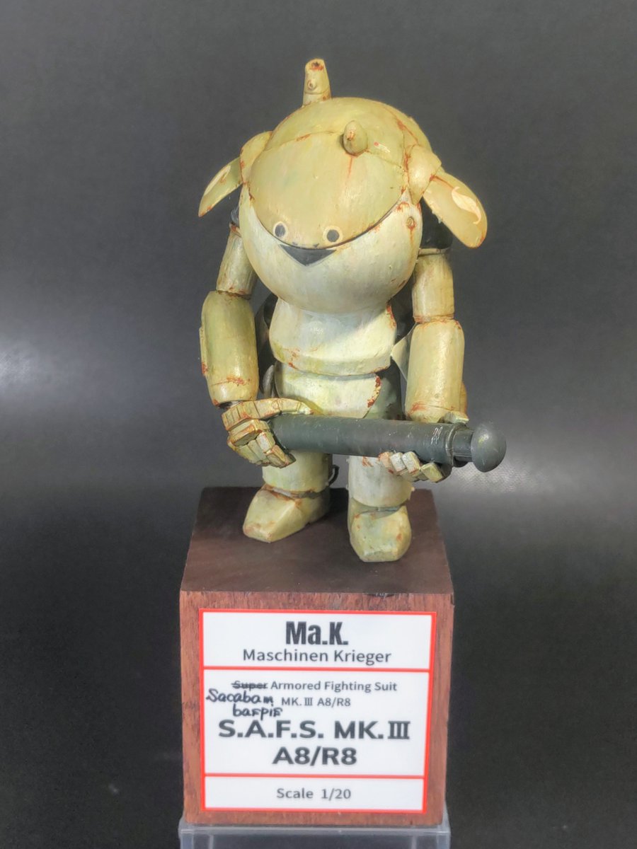 ウェーブ 1/20 A8/R8 完成っ! ボディの「福」と「竜」はレインボウエッグさん。 肩アーマーの「355」はバルケッタさんのクルマ用のデカールからそれぞれお引越し。 そしてグーと爆導索の握り手はピンクタンクさんの改造パーツをちょこっと調整して使ったプチ贅沢仕様っ #マシーネンクリーガー